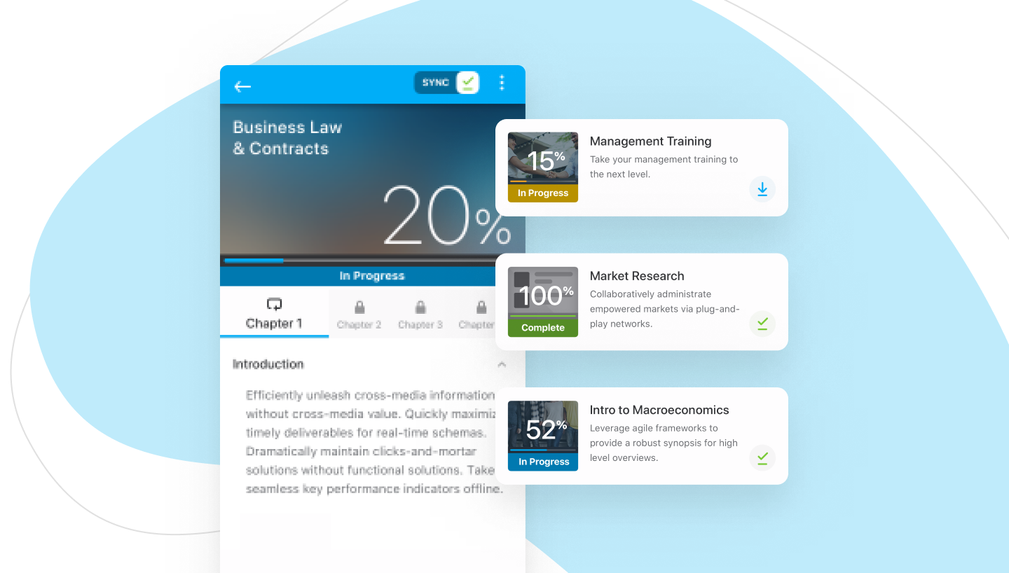 Take advantage of learning management system features that let you build mobile-first content and deploy repurposed eLearning as gig-friendly mobile learning. Extend LMS training to off-site workers using an integrated mobile app that provides on-the-go access. An LMS mobile app also makes signing in a breeze—learners just open the app and start learning. Learners don't even have to be connected to the internet to make progress. A top-notch LMS app, like the Absorb Learn mobile app, can sync progress to the learner's online profile once they reconnect to a signal.
