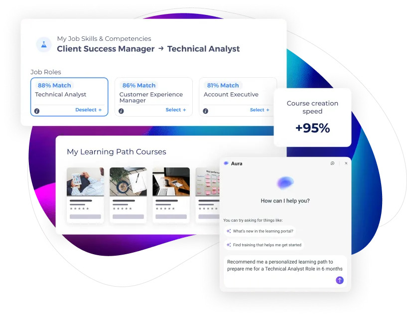 With the Aura Create AI-agent, you can turn existing product docs, SOPs, or videos into structured courses, quizzes, and voiceovers in minutes. You can also pull in SCORM, xAPI, or content from your existing library so nothing gets left behind in a migration.