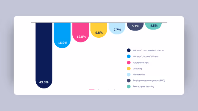 Coaching, mentorships, apprenticeships, and peer-to-peer learning are some of the most effective ways to build real, role-specific skills. But most organizations aren’t using them. In fact, 43.6% of respondents said they’re not using any people-focused learning, and have no plans to. Just 12.8% use apprenticeships. Coaching and mentorships? Even lower. It’s a missed opportunity. When done right, people-focused learning adds depth, context, and accountability that content alone can’t deliver.